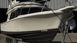 Questa è una barca che colpisce per le proporzioni e per la percezione qualitativa. Siamo al cospetto di un cantiere italiano che ha già dato prova di sé sin dagli ultimi anni Novanta, con i sui 3B T22 e T25 entrobordo, barche che si trovano tutt’oggi sul mercato in condizioni più che dignitose, segno che i materiali utilizzati reggono l’usura del tempo e che i progetti sono tutt’oggi validi. Il 3B 330 CC è un center console di circa 34 piedi fuori tutto, con un baglio molto generoso, superiore alla media dela categoria (3.60 m), ma con una lunghezza di omologazione di 9.99m, quindi entro la soglia del cd. “natantone”, che fa evitare la registrazione allo STED e i conseguenti oneri periodici. Avendo visionato anche il Bertram 34 CC (CLICCA QUI), posso dire di aver notato una affinità sulla logica architettonica, con la fusione di linee tese e nervate, armonizzate a quelle d’acqua, affilate e dall’apparenza molto “marina”. Gli spazi a bordo sono ben organizzati, con un’area, quella poppiera, destinata alla pesca d’altura, ma convertibile ad area di convivio tramite opportune opzioni che ne incrementano il comfort. Portacanne, sia a riposo che in pesca, sono disposti strategicamente dove serve; in particolare, il capo di banda poppiero ospita ben cinque portacanne ad incasso, utili come rastrelliera verticale durante la navigazione se non ci si vuole inerpicare sui rocket launchers sul t-top. Tuna door poppiera e side door sulla murata di sinistra agevolano sbarco di prede, equipaggio e attrezzature; a proposito, l’accesso alla barca è facilitata da due plancette che di serie seguono il profilo del bracket eurotransom, ma che opzionalmente possono essere prolungate per finire a filo delle eliche dei motori, opzione questa utile quando è necessario tenere gli ormeggi di poppa molto filati (si pensi a situazioni di risacca importante…