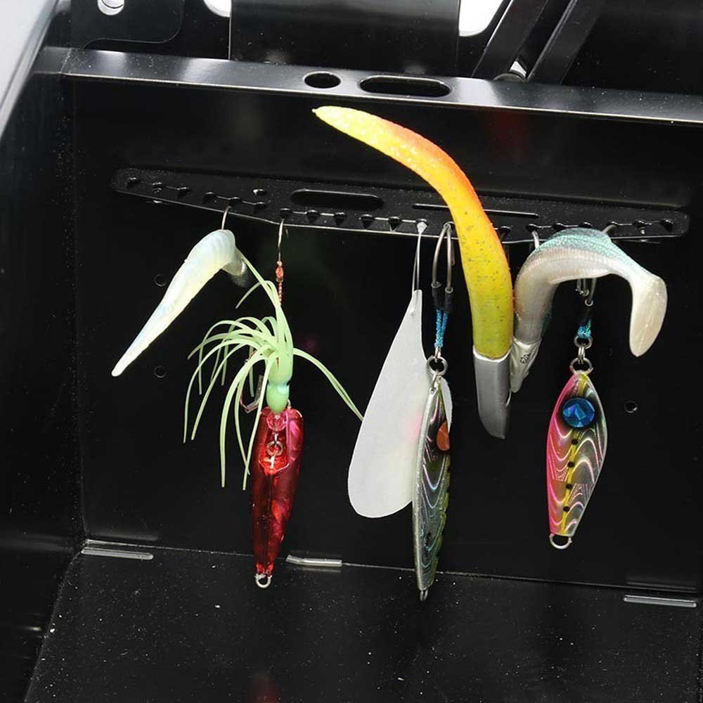 Un accessorio che ultimamente sta trovando giusta collocazione nei più moderni progetti di fisherman di serie, è costituito da una rastrelliera, fissa od asportabile, che riporta vari tipi di agganci e passaggi per utensili (coltelli, forbici, pinze) ed artificiali. Questo, se posizionato in zone non soggette al transito veloce dei membri dell’equipaggio, può costituire il giusto complemento della dotazione di bordo di un fisherman, soprattutto quando, durante le battute di pesca a traina, si è portati spesso a cambiare livree e tipologie di esche. In tal caso, la possibilità di isolare le esche già usate e quindi sporche di salino, aiuterà, una volta attraccati al pontile, le fasi di pulizia e risciacquo dell’attrezzatura, senza correre il rischio di mischiare tra le esche pulite quelle utilizzate, trovandosi in cassetta pezzi di ruggine pronti ad essere svelati all’uscita successiva…