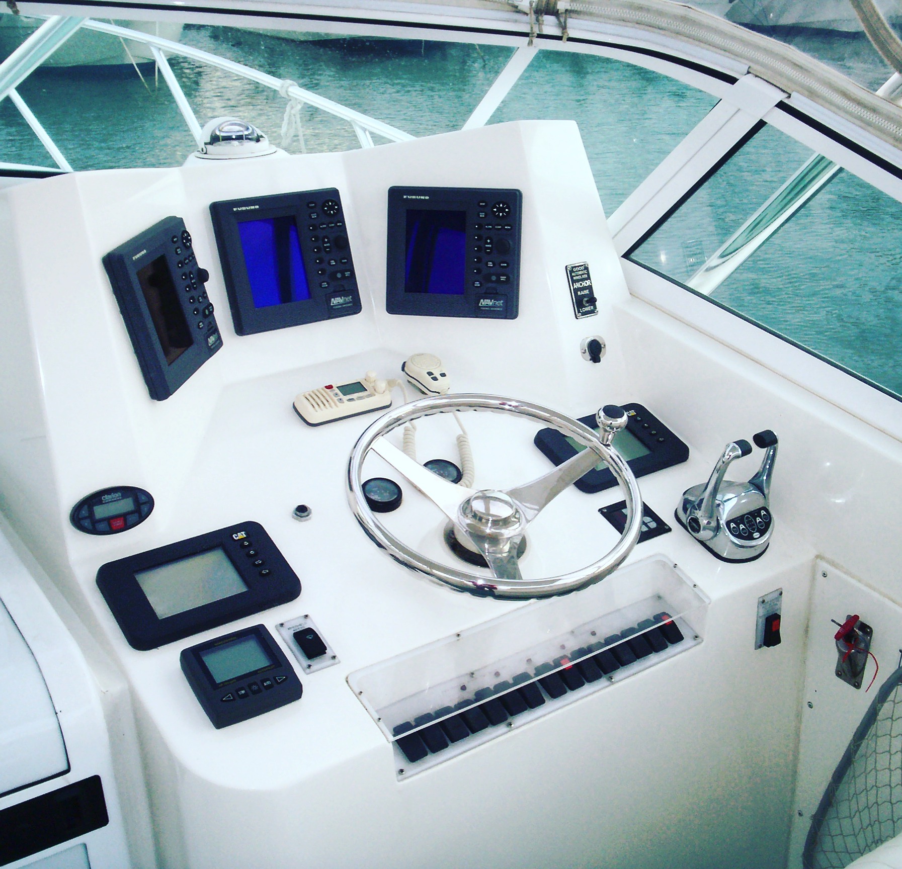 Feci modificare la dinette in modo da avere una cuccetta pullman aggiuntiva. L’elettronica di bordo (radar, gps cartografico, fishfinder doppia frequenza) era tutta su base Furuno, della serie NavNet con 3 display, tutti master, in modo da avere ridondanza in caso di avaria di uno o due display. I tre monitor erano collegati tramite router in rete, in modo da poter scambiare dati di navigazione e waypoints da uno all’altro. Il pilota automatico dapprima non fu previsto, ma il dealer lo installò a sue spese come ricompensa dell’aver rinunciato agli unici 15 giorni in cui qui alla fossa di Bari si pescano le alalunghe… per consentirgli di esibire il Madeira II al Salone di Genova, appunto.