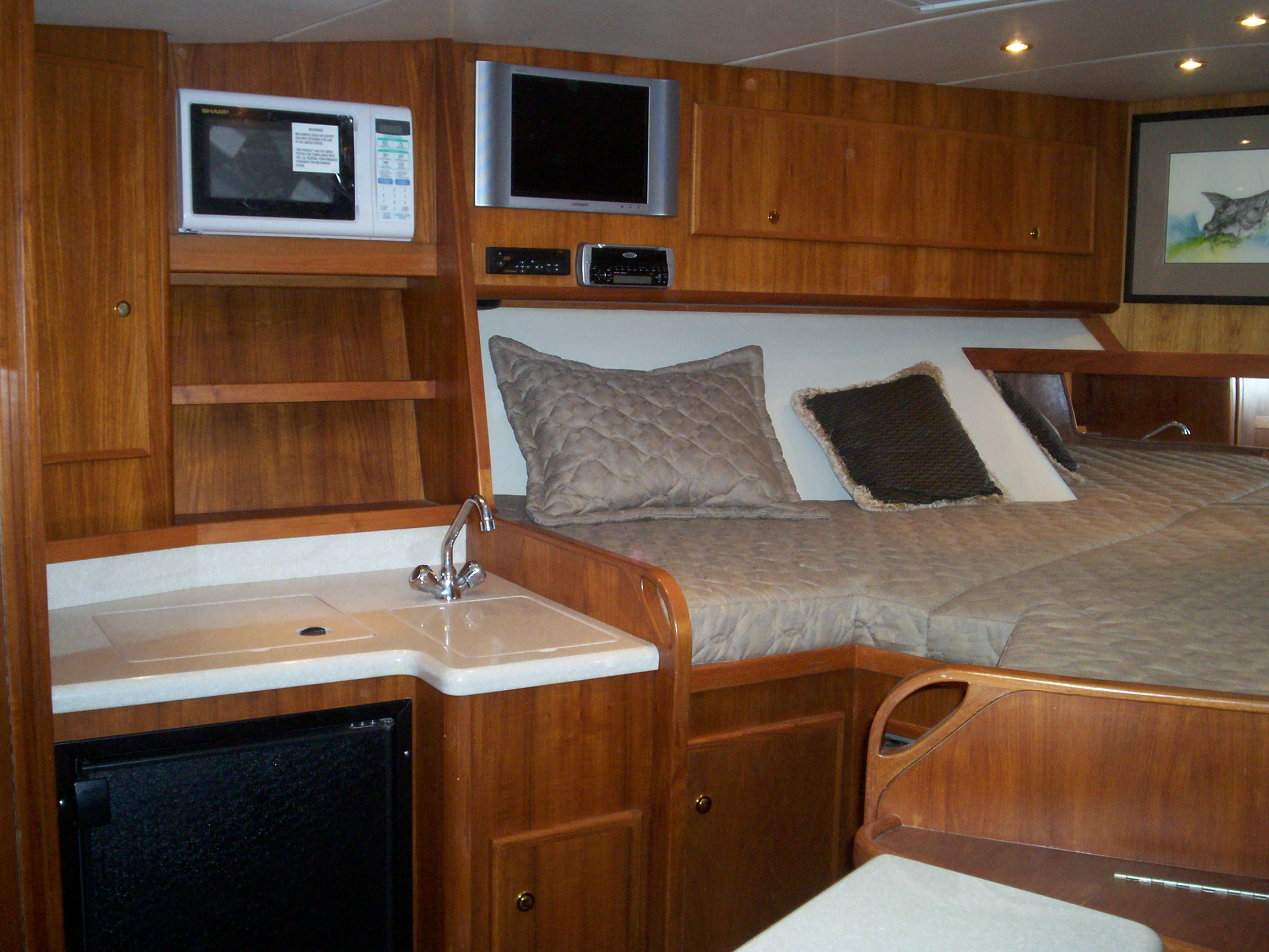 La configurazione fu il frutto di una serie di fattori, non ultimo quello di poter utilizzare questa barca dalla vocazione nettamente tecnica, anche per occasionali vacanze con la famiglia. Infatti, in beffa della tradizione del fisherman americano, scegliemmo di far installare una plancetta di poppa di dimensioni non esagerate per non intralciare le attività prevalenti che quella barca avrebbe visto svolgere a bordo: la pesca, ovviamente.