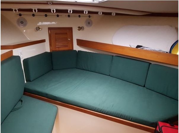 Il sottocoperta prevede una disposizione piuttosto originale: percorsi i quattro gradini in teak per scendere in cabina, sulla sinistra troviamo un divano longitudinale con tavolo, il primo trasformabile in due cuccette a castello, data la possibilità di sollevare lo schienale dello stesso. A prua un letto alla francese disposto per fianco sul lato di dritta, assistito dal passoduomo sopra menzionato (l’unico presente sulla coperta).