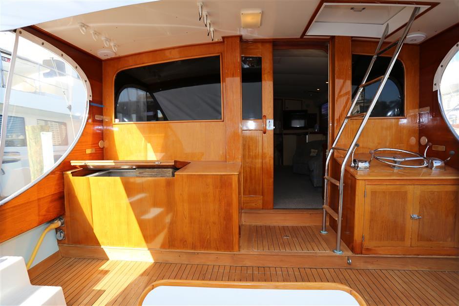 La scala di accesso al flybridge è disposta per lunghezza ed ha una inclinazione che la rende sicura anche con mare mosso. La plancia comandi del fly è raccolta in un modulo costituito da timone, manette e grandi gavoni a scomparsa che celano gli strumenti di ausilio alla navigazione. Oggi la capienza di questi vani non si giustifica, ma un tempo in cui gli schermi erano a tubo catodico, serviva che fossero così capienti. Una rivisitazione dello sfruttamento degli spazi in plancia, oggi darebbe senz’altro maggiori aree da adibire allo stivaggio.