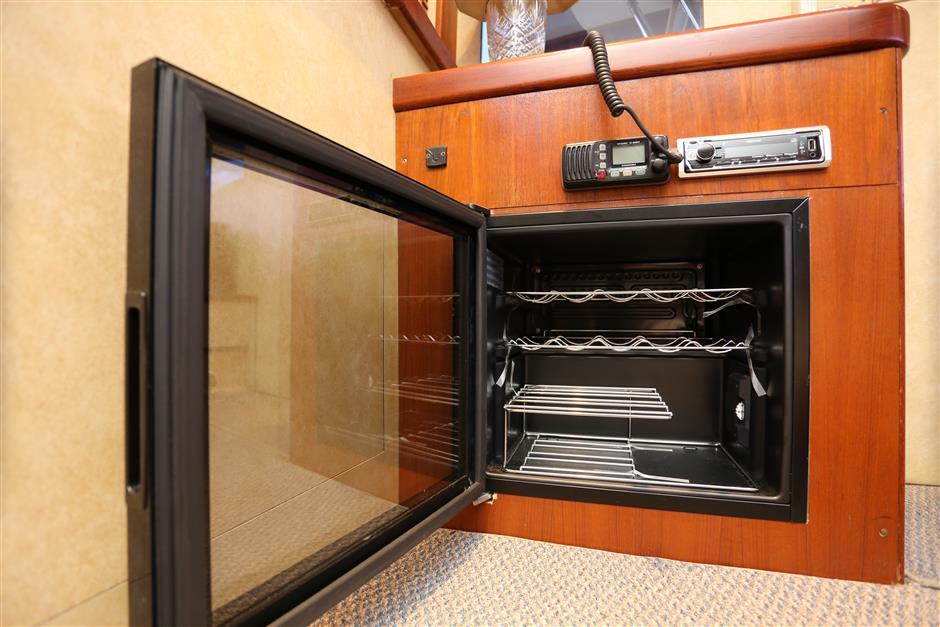 La sedia da combattimento campeggia e domina la scena, e costituisce un elemento di arredo imprescindibile per una barca che racconta la sua storia ogni qualvolta la si osservi. La paratia di separazione tra pozzetto e quadrato ospita un mobile nel quale sono alloggiati i comandi secondari (quelli principali sono sul flybridge), molto utili quando si traina o si è in combattimento con una grossa preda.