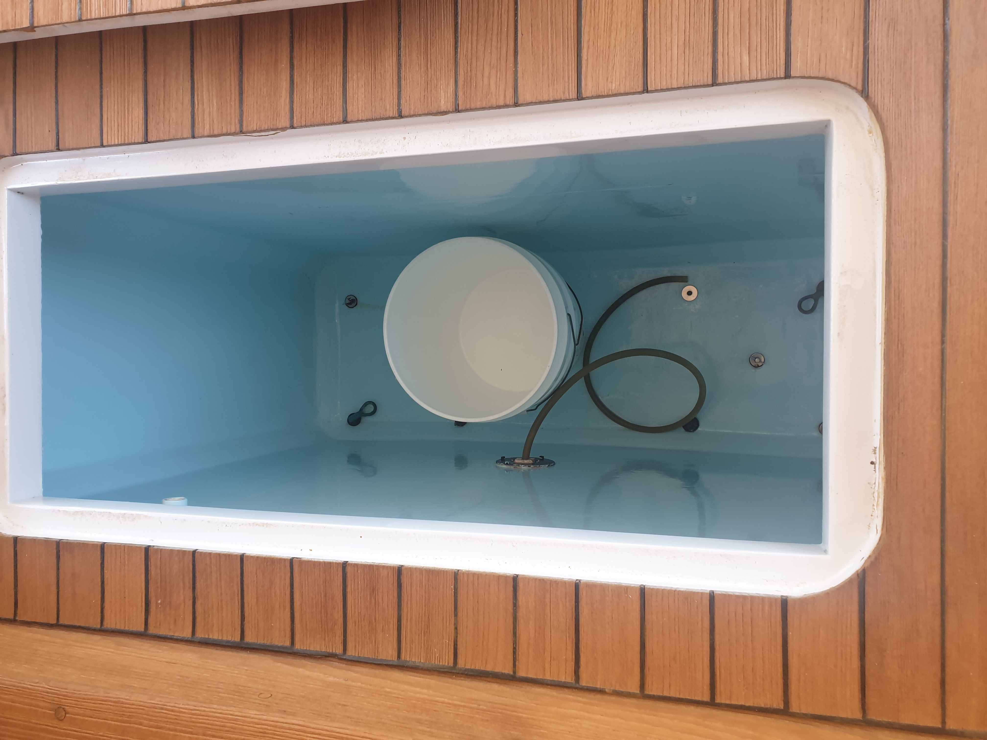 Una vasca del vivo immensa (la capacità di ben oltre 200 litri) si trova a pagliolo, poco prima della soglia di ingresso al salone.