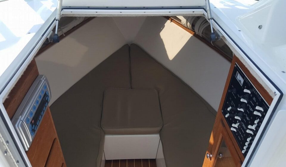 La stessa è protetta da un hard-top decisamente sovradimensionato, rifinito alla maniera dei grandi express (perfino la parte inferiore è gelcoattata con la stessa tinta dello scafo).