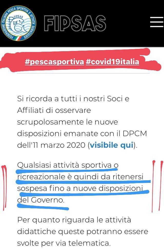Dato che non è necessario trasgredire una legge per essere puniti, ma è sufficiente trasgredire indicazioni governative dirette all’ordine ed alla tutela della salute pubblica, è di fatto ESTREMAMENTE SCONSIGLIATO ESERCITARE L’ATTIVITÀ’ DI PESCA SPORTIVA per questioni di tutela della salute pubblica, come a mio parere ben interpretato dalla F.I.P.S.A.S: