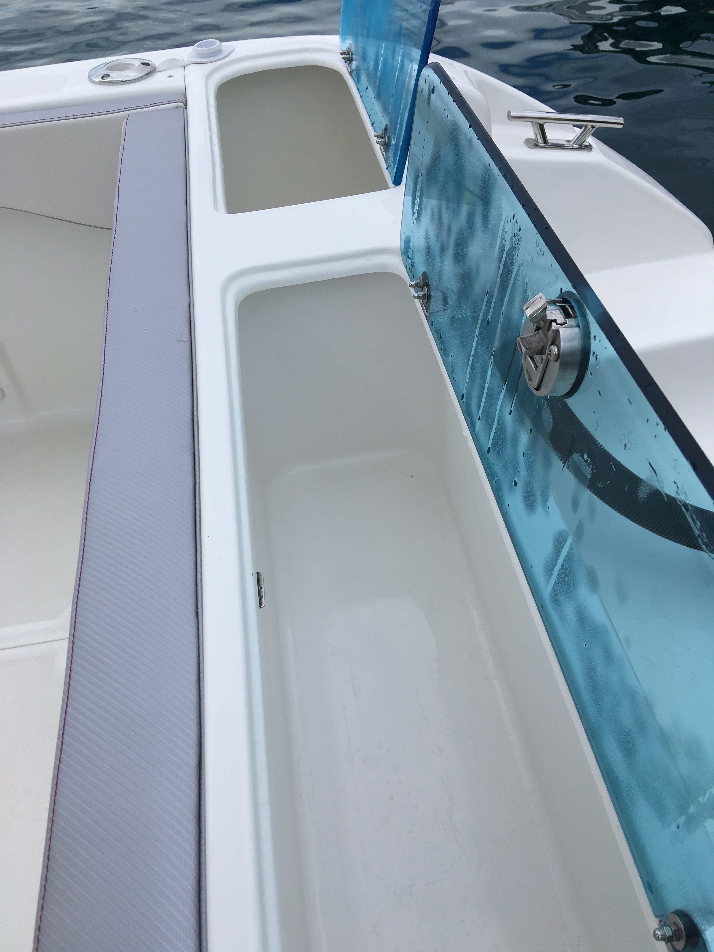 Partendo da poppa, nello specchio è ricavata una enorme vasca coibentata provvista anche di pompa di ricircolo nella sezione di dritta. I coperchi in policarbonato azzurro trasparente consentono di tenere d’occhio le esche anche senza aprire la vasca.
