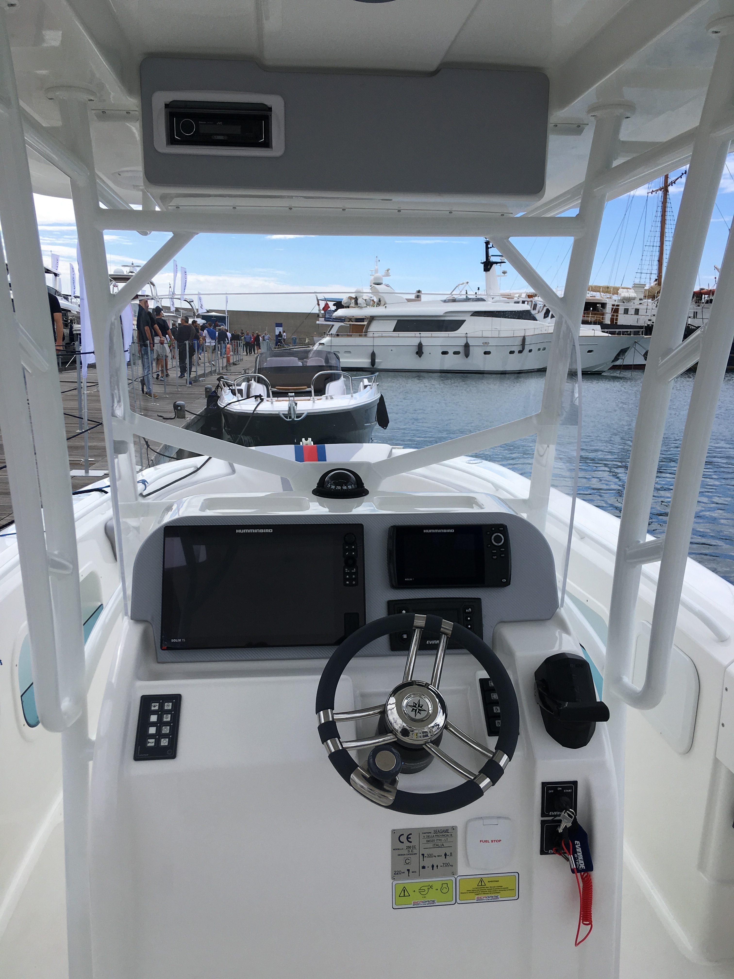 La plancia di comando è ampia ed accoglie agevolmente due display da dodici pollici, protetti da una palpebra frangivento in policarbonato. La struttura del T-Top è generosa nelle sezioni e rifinita con powder coating bianco, il che rende anche molto più duraturo il metallo stesso e lo protegge dalle tipiche infiorescenze a cui è soggetto l’alluminio esposto agli agenti atmosferici.