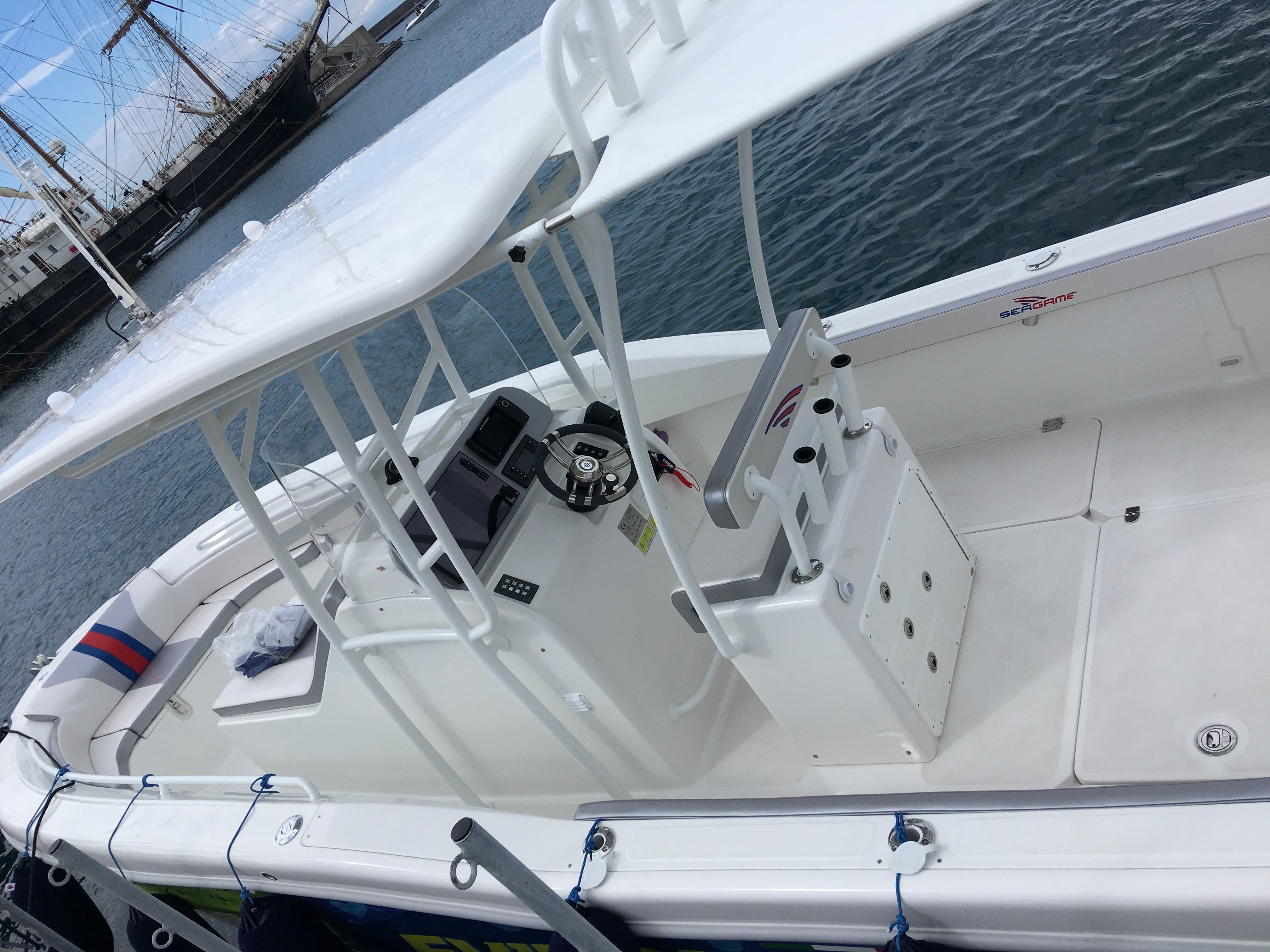 Parliamoci chiaro e tondo: il center console è una barca estiva, nasce come tale alle basse latitudini degli States ed una postazione guida protetta da una palpebra prodiera e da un T-Top non può che ambire a questo, a meno di non equipaggiarla con tendalini perimetrali di chiusura. E se vogliamo, io lo vedo come un controsenso: il center console è fatto per godere della navigazione en plen air e non per trainare per ore a gennaio sotto la pioggia fina.
