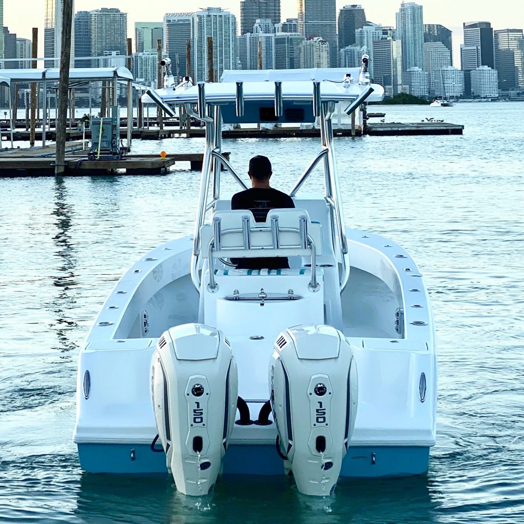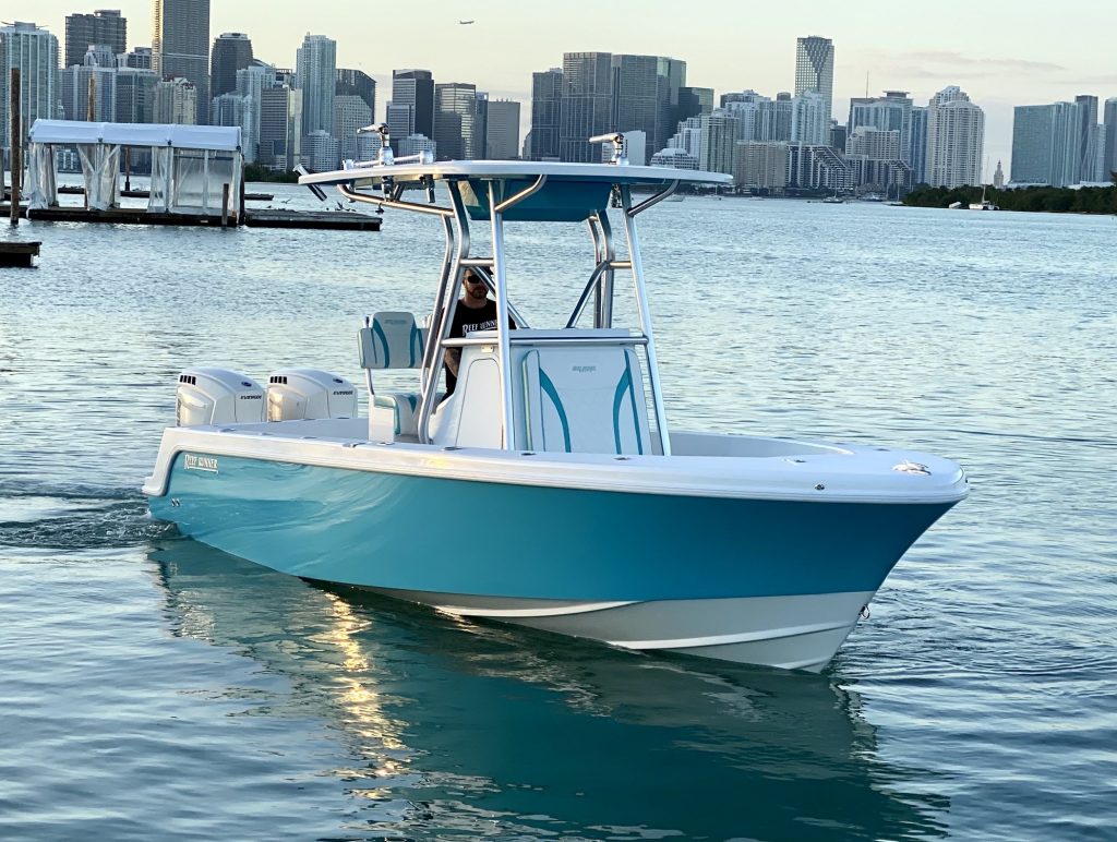 Una mosca bianca nel panorama dei center console moderni, che spingono sempre più in su l’asticella delle dimensioni di scafo minime per le motorizzazioni fuoribordo, vuoi perché le potenze dei motori sono salite vertiginosamente, vuoi perché il mercato ha nel suo DNA la caratteristica di spingere ad una spesa maggiore, che qui si giustifica con la scelta obbligata -per chi vuole il bimotore- ad orientarsi su uno scafo più grande.