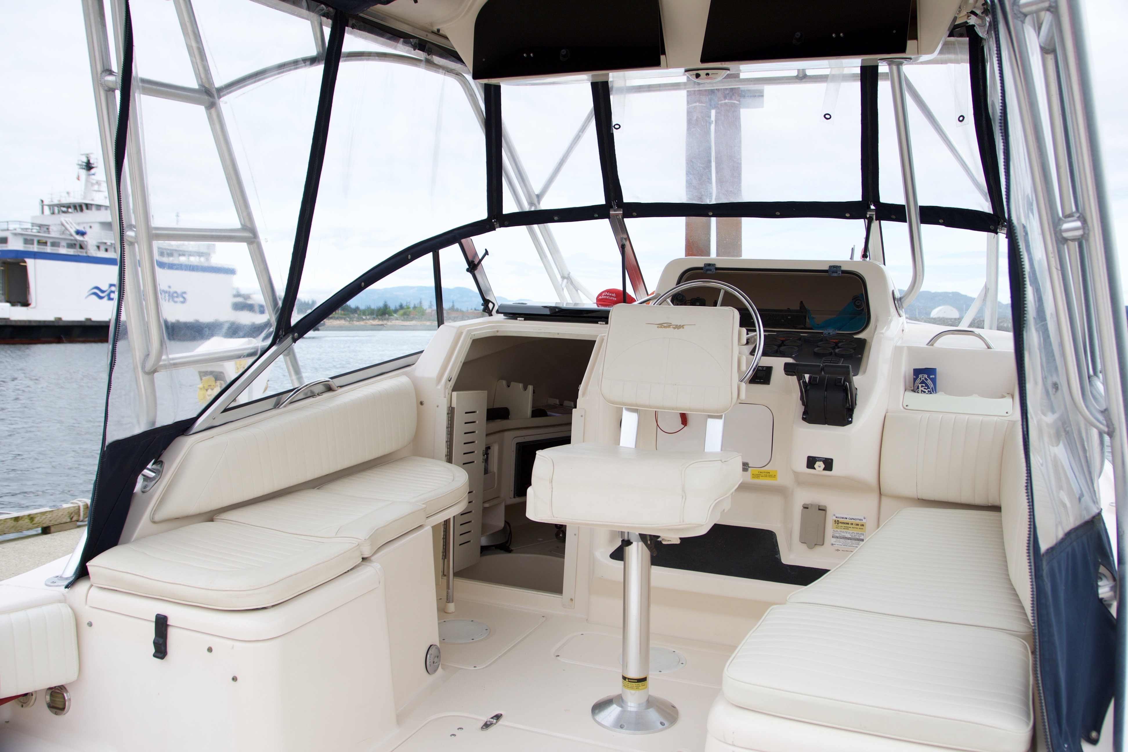 La poltrona di guida è una classica e durevole Pompanette de luxe ladderback, assistita da un poggiapiedi integrato nella stampata della plancia. Questa ha un vano a chiusura ermetica dove collocare l’elettronica di ausilio alla navigazione, coadiuvato da un altro vano sospeso proprio sotto il tetto dell’hard top, utile per installarvi vhf e radio hifi. Entrambi i vani sono richiudibile sottochiave.