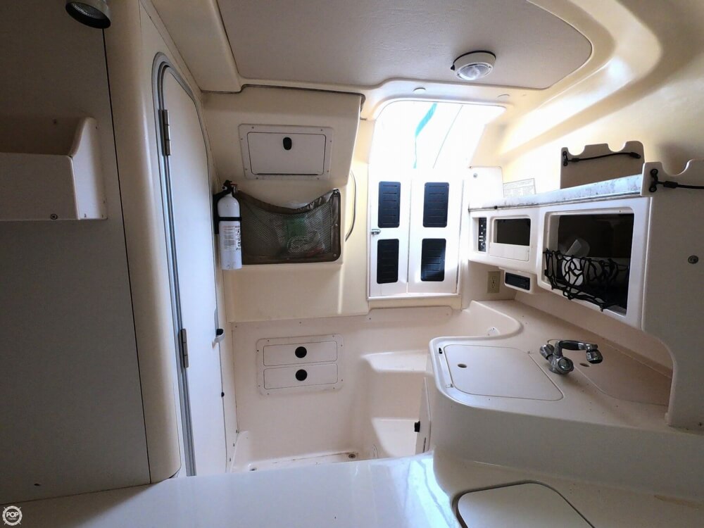 In cabina troviamo una disposizione essenziale ma efficacie degli spazi: una vera cuccetta matrimoniale full size a prua, che accoglie nella parte inferiore il frigorifero.  Il cielino della cabina prevede occhielli portacanna per un totale di sei canne da pesca.