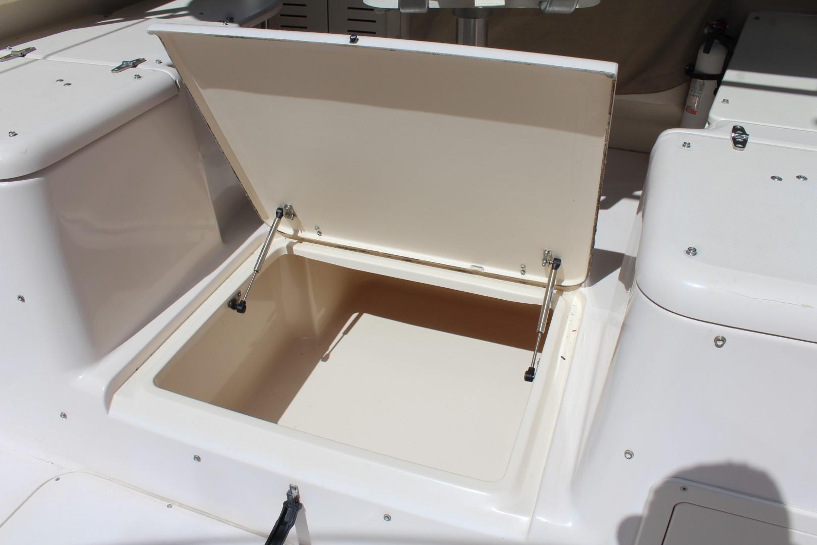 Dicevamo a proposito delle vasche: ne troviamo due ai giardinetti, estraibili per dare accesso ad impianti e batterie; una molto grande (quasi 300 litri) per il pescato, coibentata e posizionata nel piano sopraelevato del ponte di guida, un’altra, provvista di impianto di ricircolo ed ossigenatore, nel mobile di sinistra, contrapposto alla rigging station con tagliere per le esche, lavabo ad acqua dolce e stivaggi per attrezzature e minuterie. Entrambi i mobili sono provvisti di cuscini per poter essere facilmente convertite in sedute mezzane.