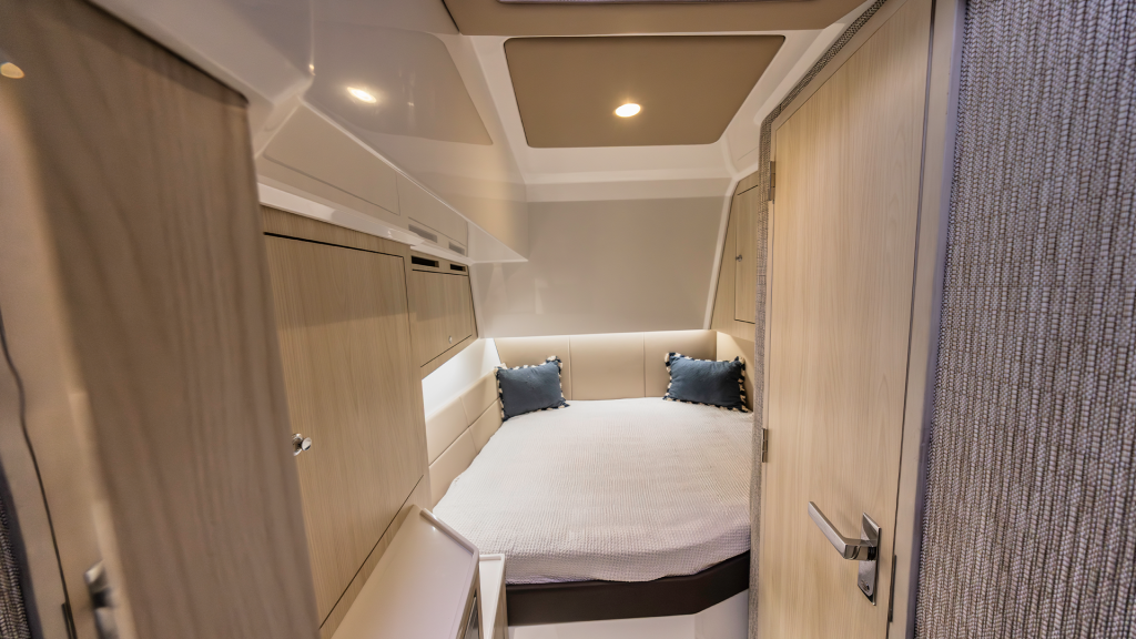 Un center console con una cabina decorosa, per giunta, in quanto oltre ad una cuccetta matrimoniale, offre anche un bagno separato di dimensioni generose ed ampie zone di stivaggio, il tutto, climatizzato.