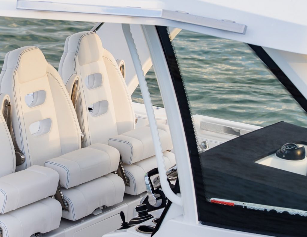 Come d’uso nell’ultima decade per lo meno, il t-top è in vetroresina, poggiato su un parabrezza in vero cristallo temperato, per ridurre la componente deteriorabile (tendalini) al minimo indispensabile per proteggere metà dei lati e la zona poppiera, in luogo dei classici tendalini perimetrali a 360°, altrimenti indispensabili in presenza di un t-top classico.