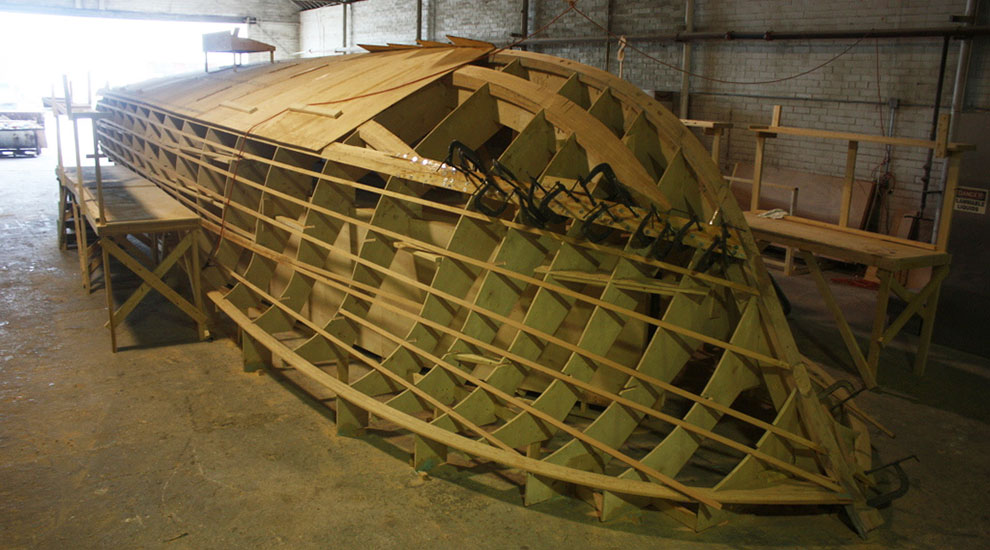 In piena evidenza in questa foto la tecnica custom planked, che prevede la sovrapposizione di strati di legno sullo scheletro dello scafo ottenuto tramite ordinate e madieri di legno di abete. Diversi strati sono deputati a rinforzare la ruota ed il dritto di prua, dal quale si sviluppano i masconi.