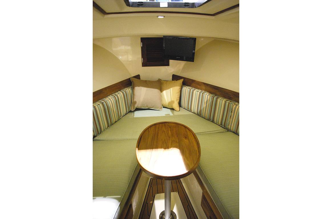 Un divano a V prodiero funge da zona pranzo interna (sebbene il ponte di guida inviti molto più a sfruttare la barca per questo fine all’aperto. Il divano si covnerte in matrimoniale abbattendo il tavolo centrale ed integrando la cuscineria con un elemento centrale.