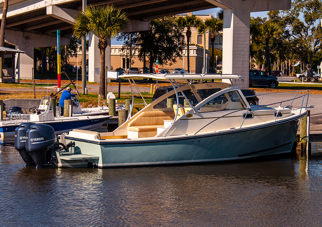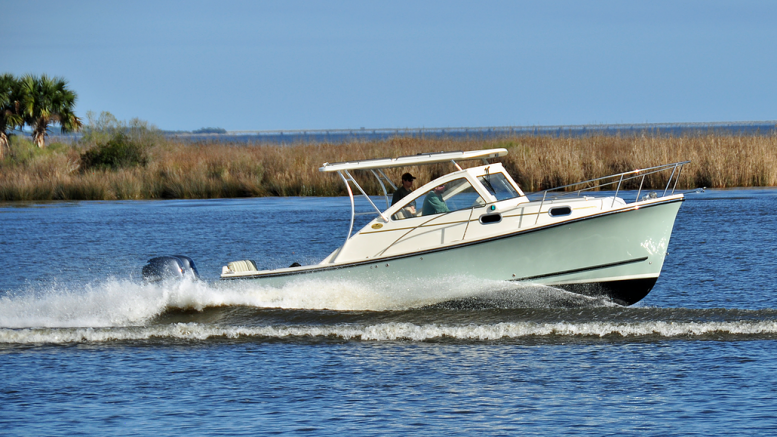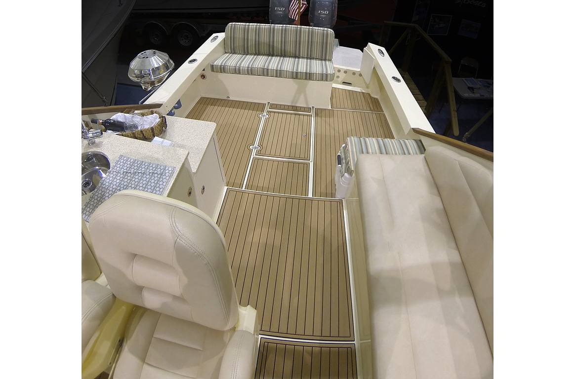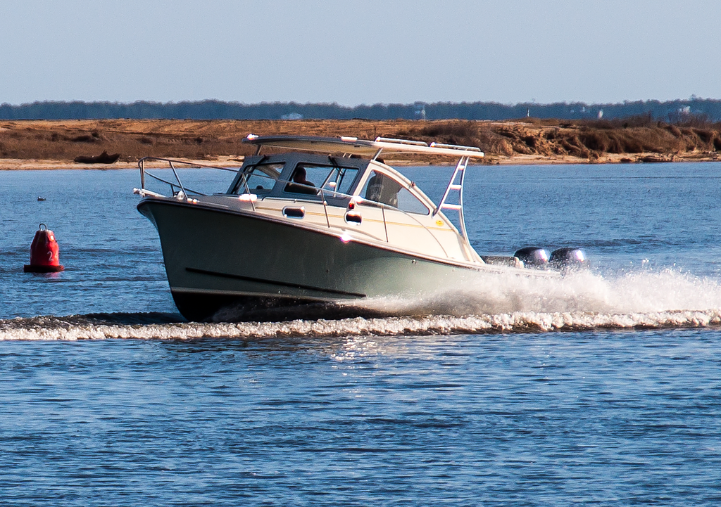 Le prestazioni, con 2x150cv Yamaha quattro tempi, si attestano sui 20 nodi di crociera continuativa e di 30 nodi di velocità di punta. L’autonomia è assicurata da due serbatoi speculari di benzina della capacità di 360 litri cadauno. La riserva di acqua dolce è invece di 115 litri. La navigazione è asciutta grazie al ginocchio pronunciato ed agli spray rails disposti appena sopra la linea di galleggiamento. Il flare è gradevolmente pronunciato e si concilia con lo spirito marinaro di un downeast in piena regola.