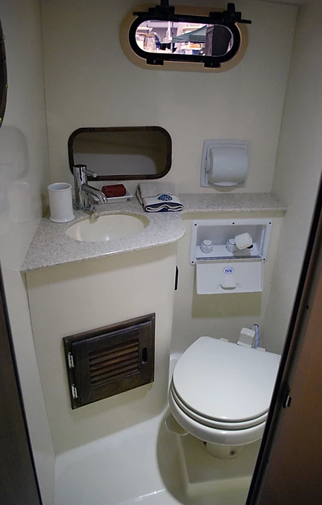 Il locale toilette separato è dotato di lavabo, stivaggi con specchio e di doccia e pagliolo autovuotante. Sotto il ponte di guida è ricavata una seconda cuccetta doppia, ampia abbastanza per accogliere due adulti o per essere utilizzata come grande vano di stivaggio di attrezzature e dotazioni.