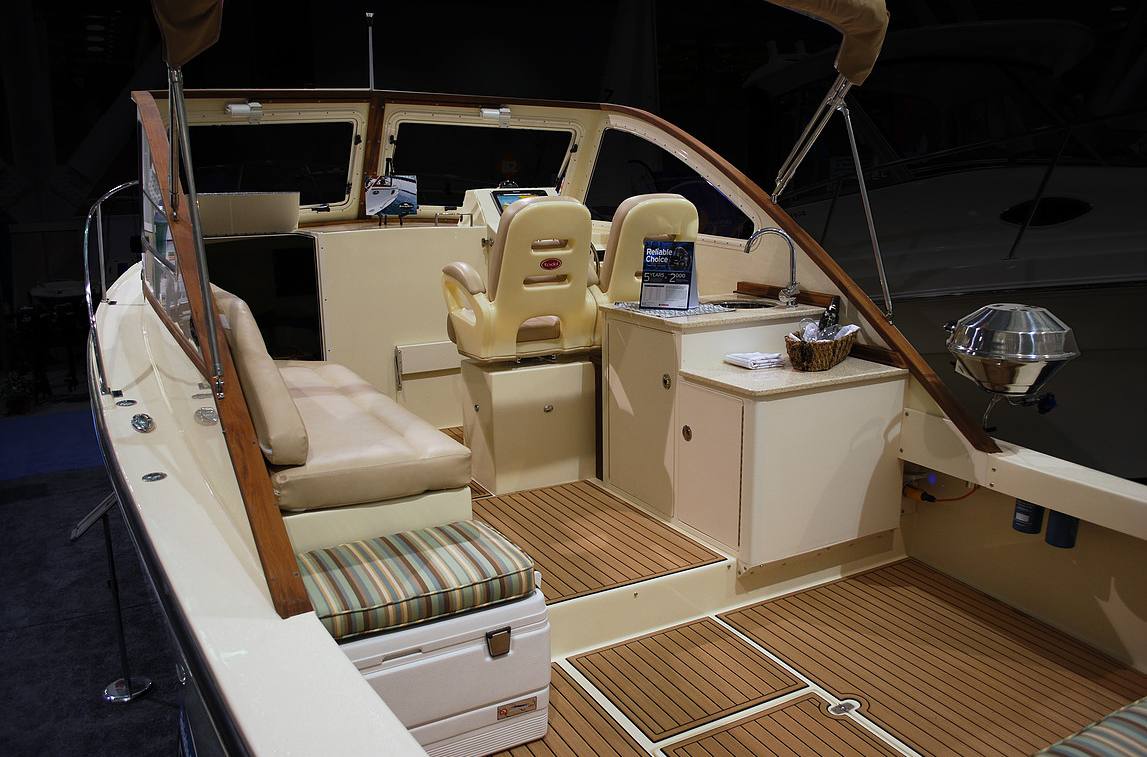 E’ un downeast in piena regola: grande parabrezza in cristallo, tuga in rilievo, oblò e dritto di prua poco inclinato; assetto in navigazione tipico delle carene semiplananti con deriva in chiglia, ma un pozzetto che fa accendere più di una lampadina in testa.