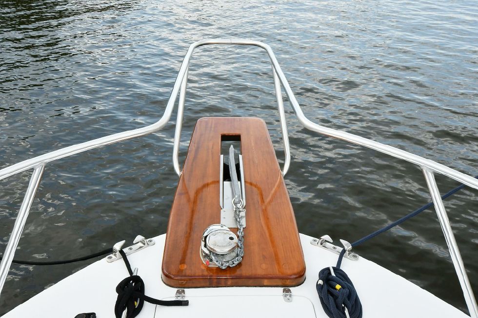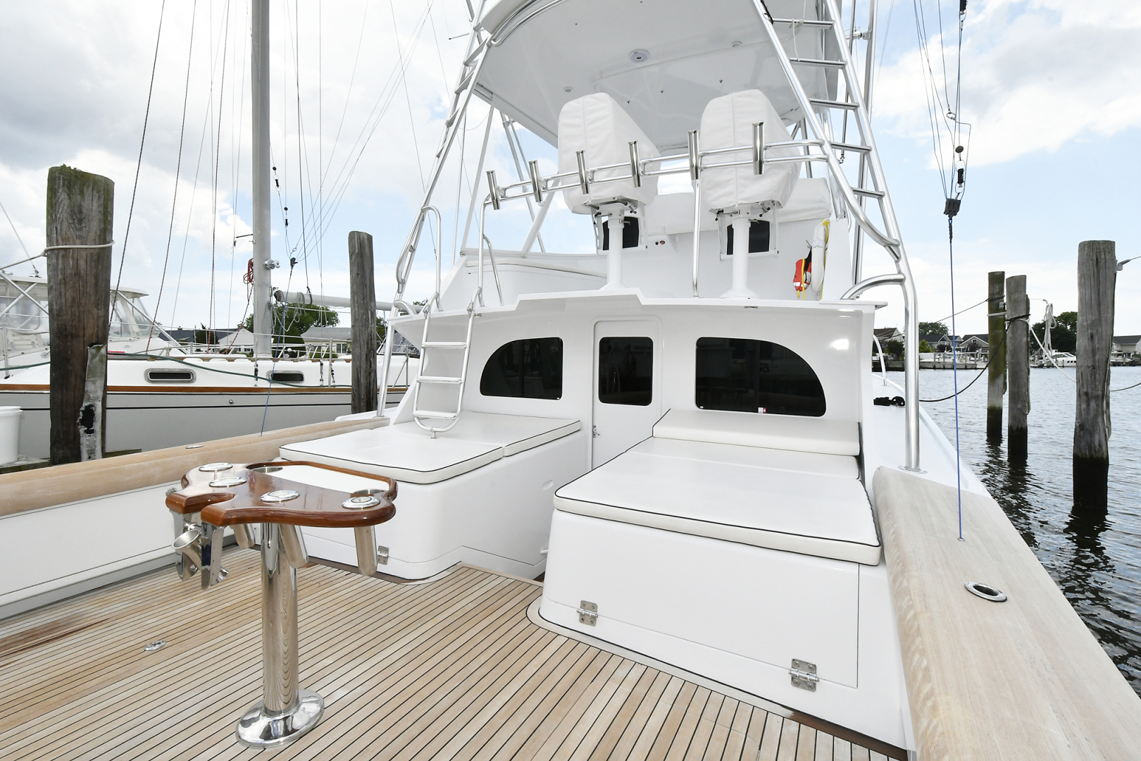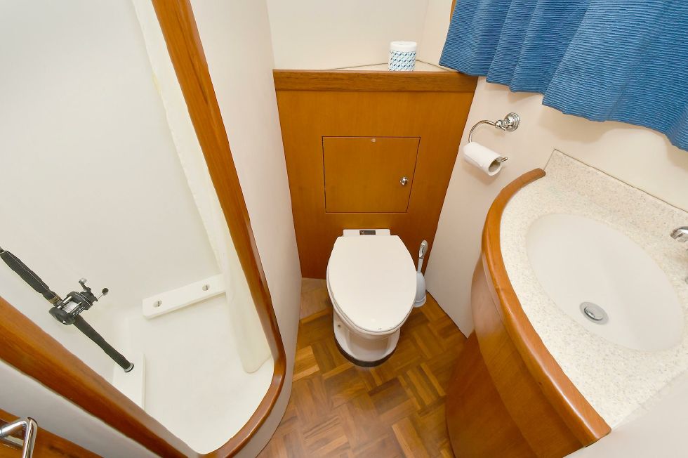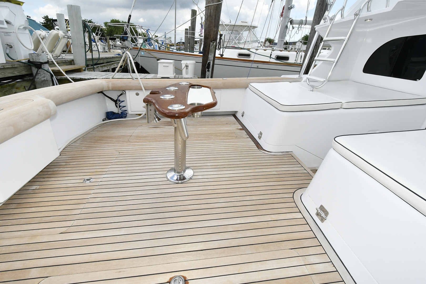Il pagliolo era in antisdrucciolo diamantato di serie, ma l’opzione del teak dogato è stata praticamente scelta da tutti i pochi committenti dei 42 Flybridge prodotti. Gavoni a pagliolo ed una vasca del vivo a dir poco enorme completano l’allestimento per la pesca, assieme a rastrelliere per raffi e canne con chiusura a chiave, sotto entrambe le murate laterali.