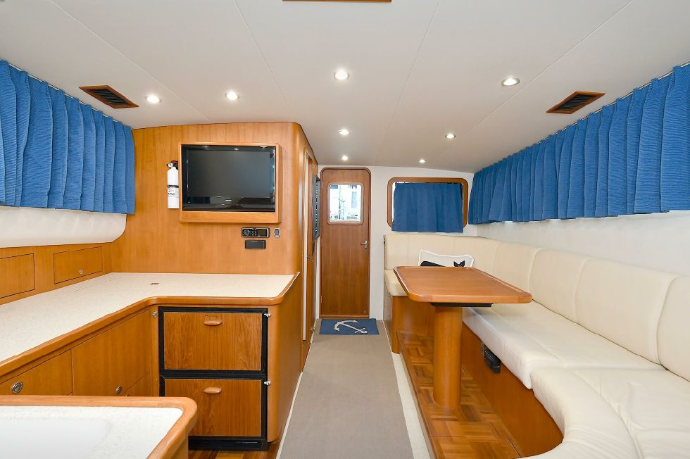 Internamente ai più può apparire scarna ed eccessivamente essenziale, ma è quella sobrietà che la rende speciale: è una barca nata per la pesca, senza compromessi, ma al mondo c’è chi, anche per andare a pesca con gli amici, richiede classe e raffinatezza. Il salone è un open space con dinette a C in molti casi (vedi foto), con due dinette contrapposte in altri. La cabina armatoriale è molto spesso ridotta ad una cuccetta a V, senza nemmeno paratia di separazione con il quadrato, il che avvicina le realizzazioni di Liberty alla concezione delle “picnic boats” di Hinckley, Ellis ed altri gioiellieri delle imbarcazioni custom americane.