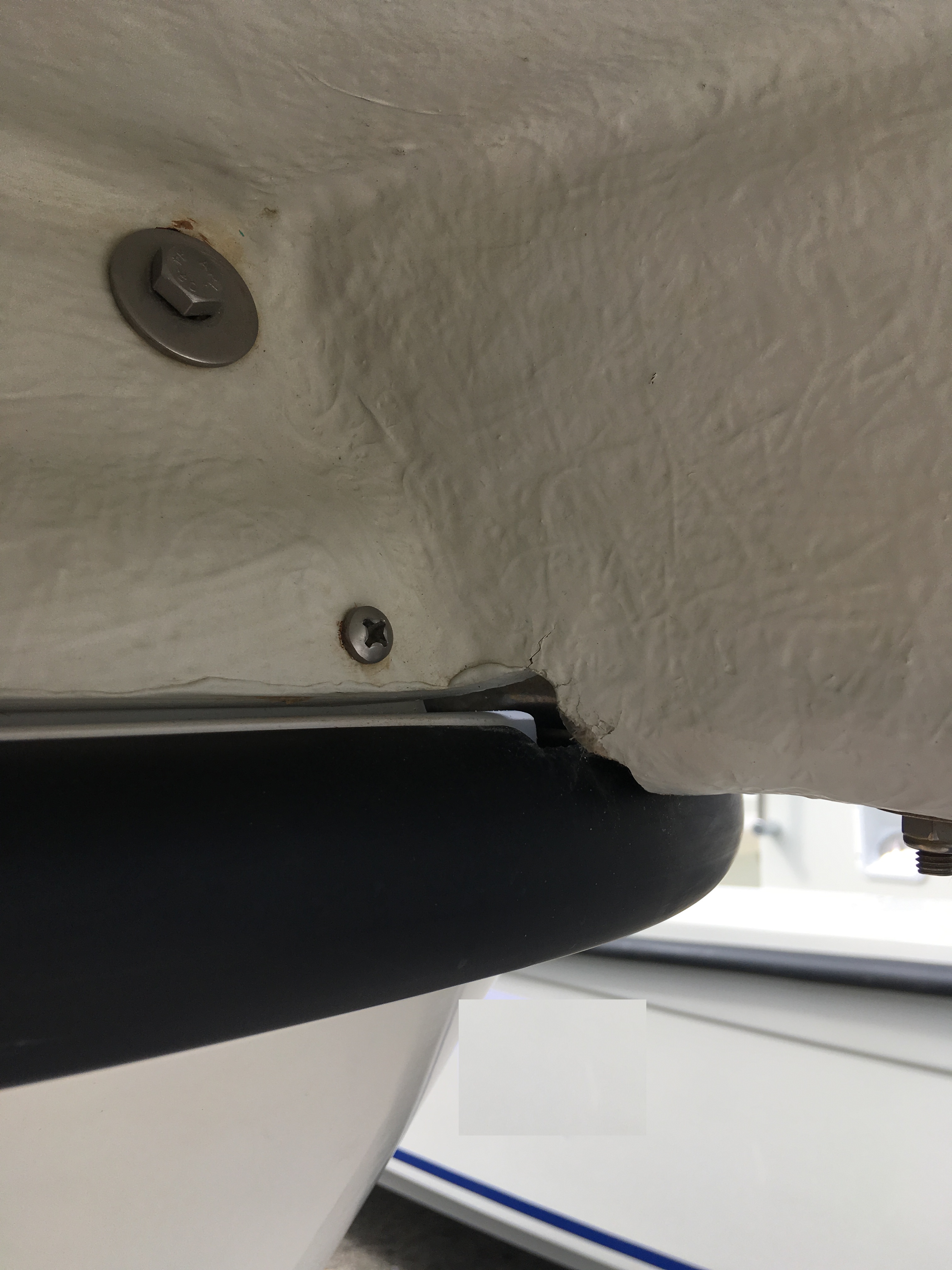 Altro dettaglio che mi ha colpito (e quasi affondato…) è stato ciò che si intravedeva in fondo a questa delfiniera: un varco nella linea di giunzione scafo-coperta giusto sopra il bottazzo, presumibilmente per l’alloggiamento del musone dell’ancora ove la barca non venga equipaggiata con la delfiniera. Una zona non rifinita, non tanto per l’occhio (non sarebbe visibile fuorché con barca su taccate, dalla parte inferiore) quanto per possibile intrusione di acqua con mare di prua od a seguito di forte delfinamento. perfettibile anche il fissaggio della delfiniera stessa, affidato a due viti autofilettanti nella parte inferiore e due bulloni con controdado in quella superiore, con rondella piatta.
