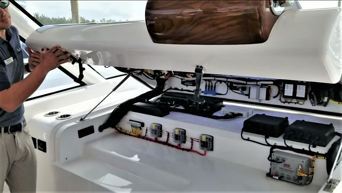 L’interno della plancia del Mag Bay 42 Express è un esempio di esecuzione dei cablaggi ed immediatezza di intervento. La pulizia delle linee elettriche consente una lampante chiarezza a primo colpo d’occhio, esaltata dall’interno completamente rivestito in gelcoat. Difficile riscontrare questa cura realizzativa su barche di pari segmento.