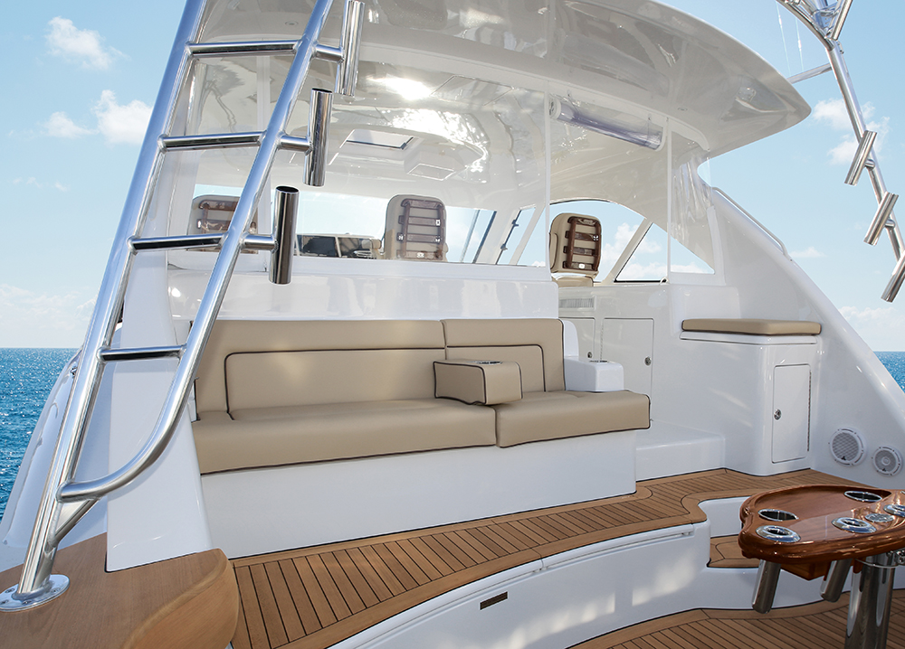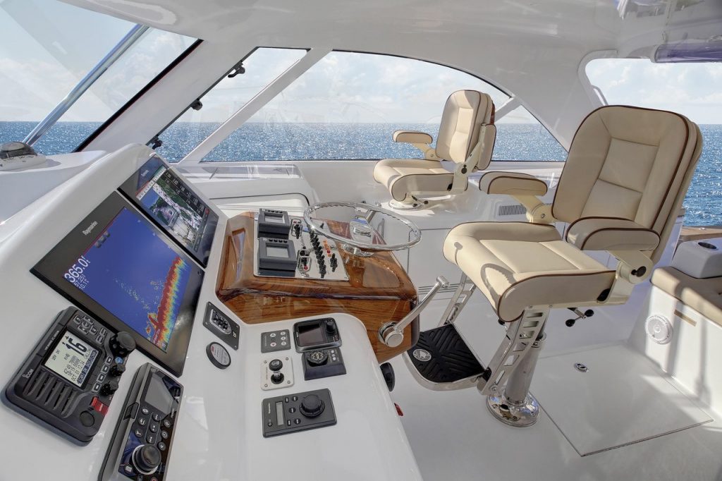 La plancia di comando è in stile Palm Beach, quindi con helm pod in mogano lucidato a specchio e comandi monoleva, ideali per essere manovrati fronte poppa, condizione essenziale quando lo skipper deve assecondare i movimenti della lenza in trazione su una preda importante.