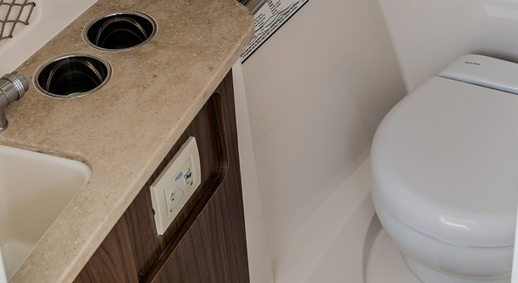 Senza dimenticare che questa barca nasconde, in una delle due console, un locale bagno vero, con tanto di piano lavello in corian e mobili di stivaggio, oltre ad un vano porta dotazioni ricavato nella console opposta. L’area prodiera viene isolata da una porta a libro che isola il transito (sia di persone che di aria fredda durante la stagione invernale…) da prua a poppa.