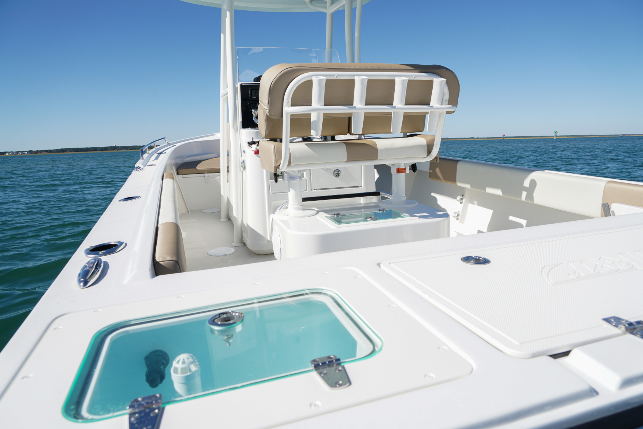 In tale posizione si potrà innescare e trasferire in mare l’esca viva senza imbrattare il calpestio del pozzetto, semplicemente facendola transitare all’esterno dello specchio di poppa.