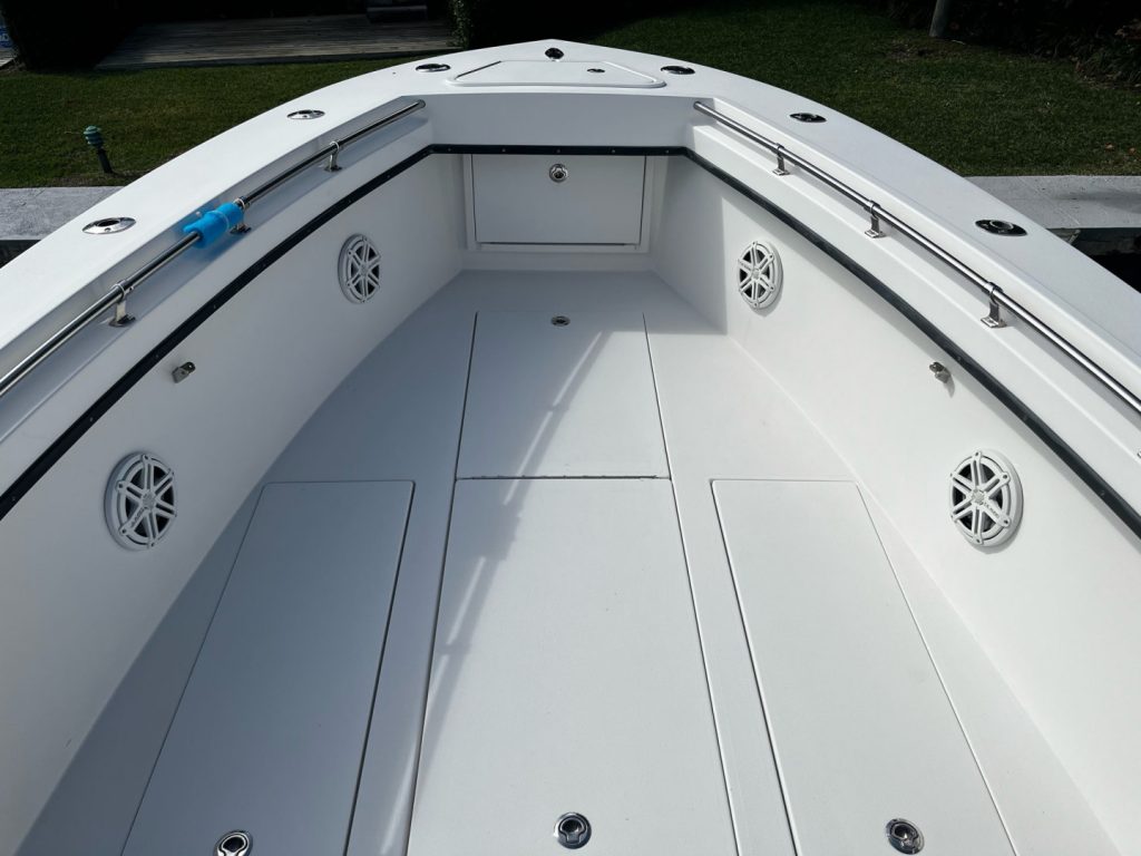 La potenza a poppa dovrà abbondare perché questo scafo esprima al meglio le sue potenzialità, lo spazio a bordo è sovrabbondante sia come superfici calpestabili, sia come aree di stivaggio del pescato sotto i pagliolati, con vasche del vivo amplissime, fish boxes coibentati e gelcoattati internamente, provvisti di maceratori e drenaggio diretto fuorobordo, una console che, all’interno, consente di posizionare in ordine e con chiarezza tutti i cablaggi elettrici ed elettronici, in modo tale da poter intervenire tempestivamente in caso di avaria in mare.